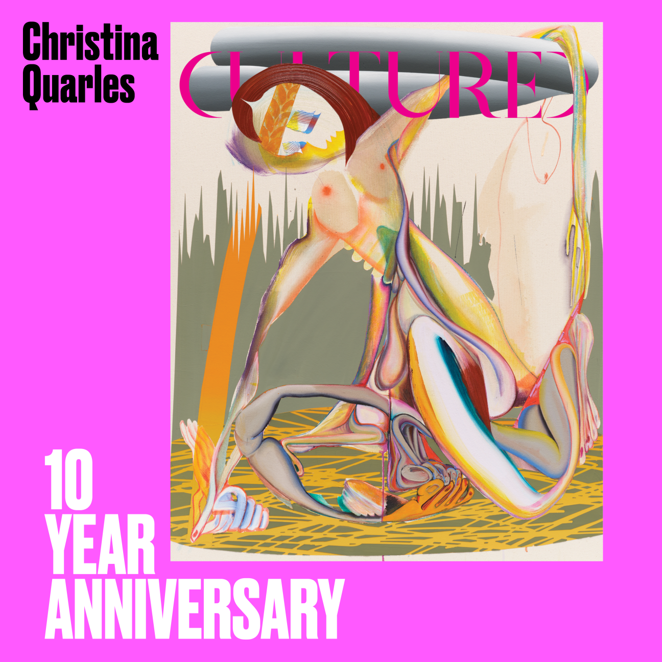 Chicago-born, and Los Angeles-based Christina Quarles works with paint in order to deconstruct its assumptions and weighty historical lineage​.“I find the baggage that comes along with painting—the unspoken but highly regulated historical context that structures the legibility, taste and value of a painting—to be a useful medium to unpack identity and what it is to live in a body​," she told William J. Simmons when the subversive artist—still early in her practice—was highlighted on Cultured's Young Artists 2019 list. Three years and several exhibitions later, Quarles reunites with Cultured once again to create our next commemorative cover in honor of the magazine's 10-year anniversary, seen above.