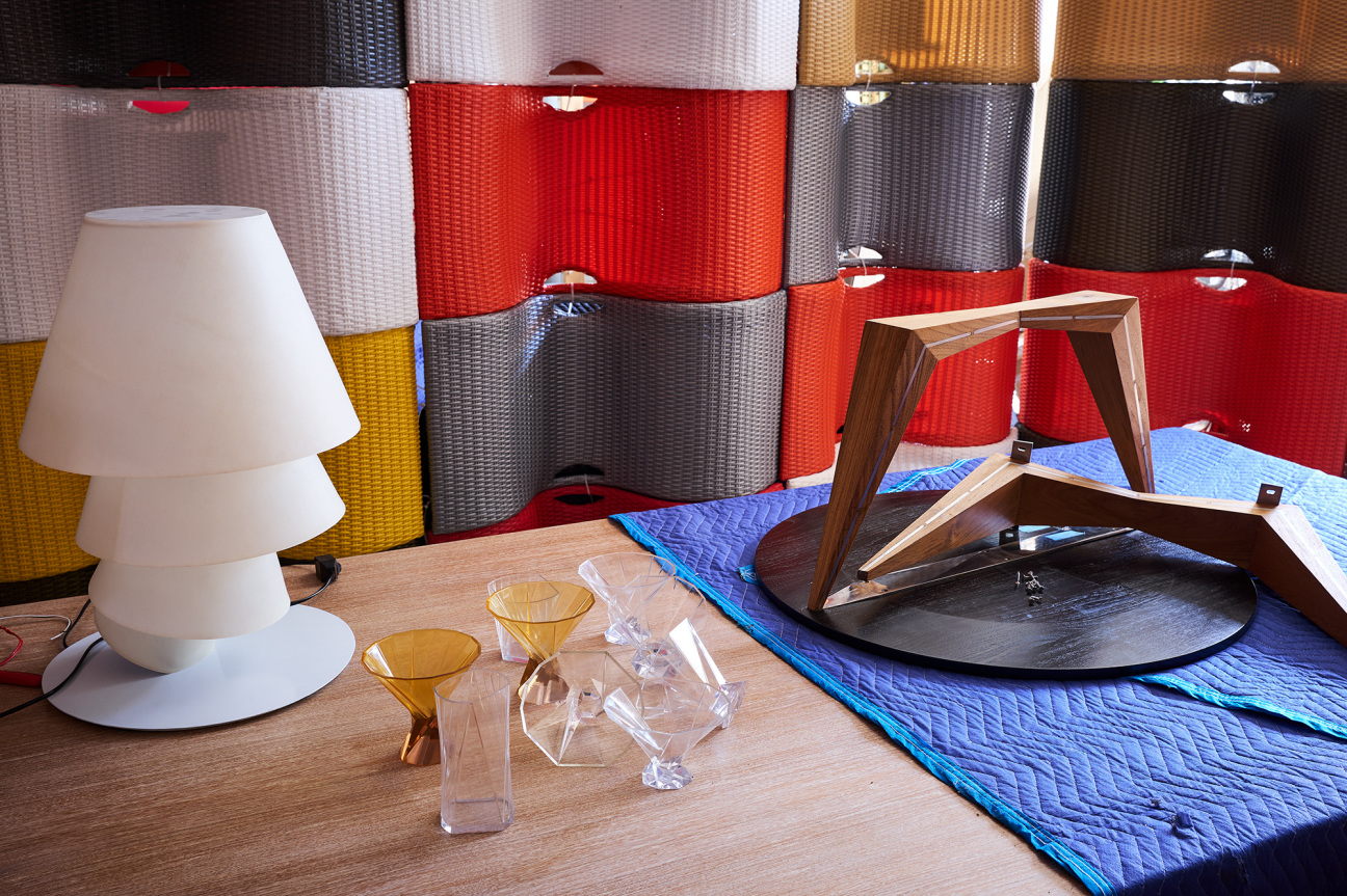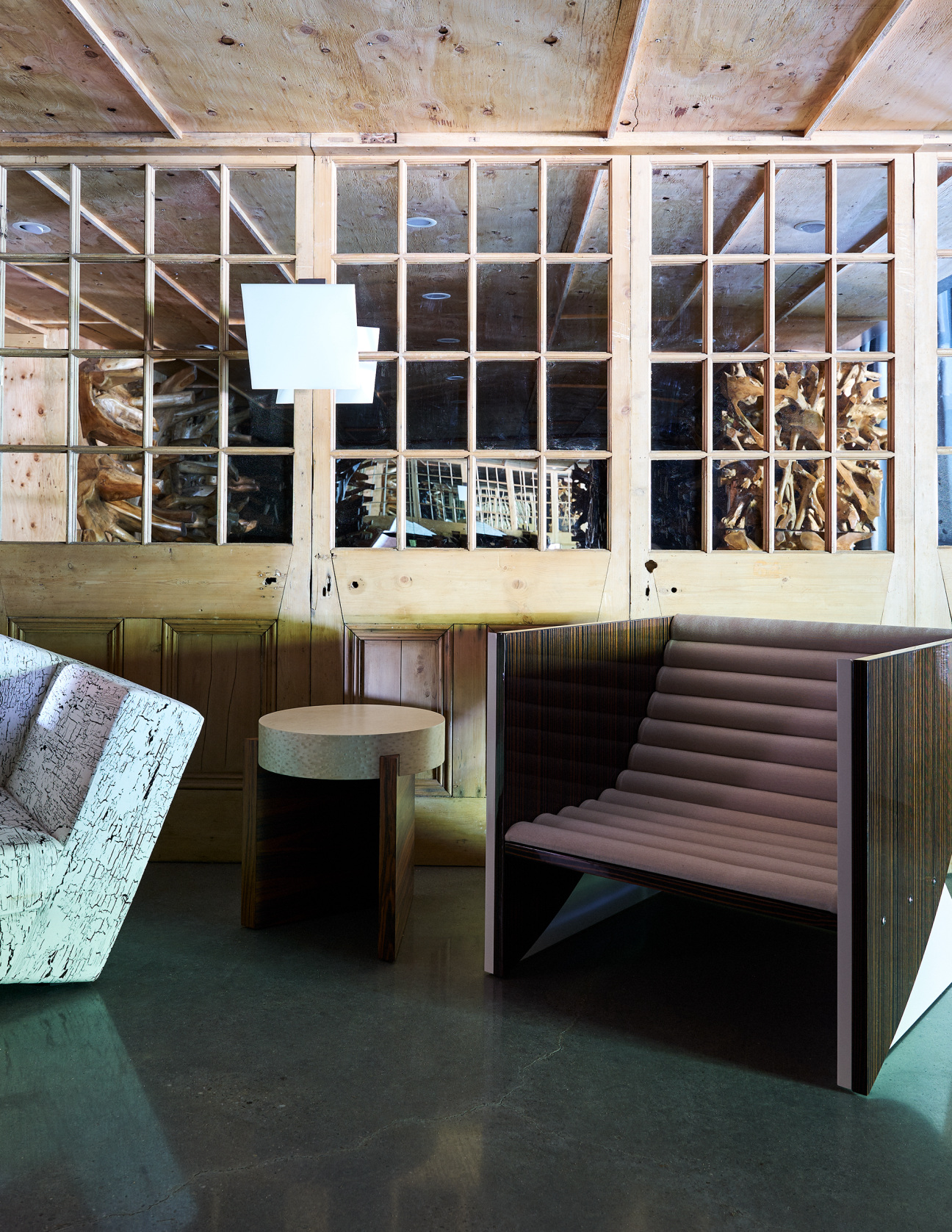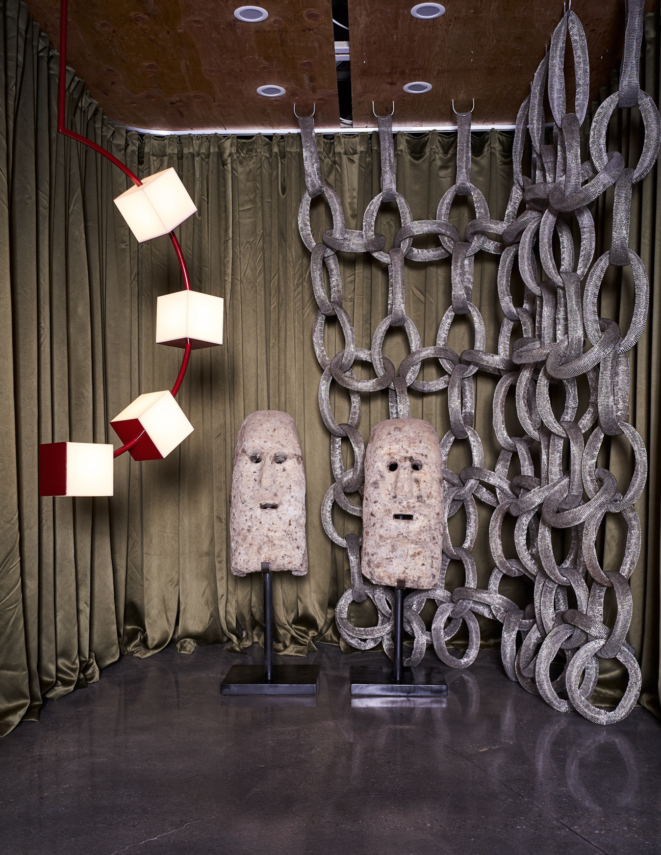 Elsewhere in the studio, folded aluminum triangles form the spiraling base of a glass-topped side table in a bar framed by original doors from the Savoy Hotel in London. A stainless steel oversized chain-link decorative screen hangs in front of a deep green curtain, forming a handsome vignette with a powder-coated red pendant where square lightboxes fall down a curved metal arm and stone Balinese heads. New armchairs from Eicke’s Soft series and another not yet released sit in front of more historic paneling, this time inset with mirrors.