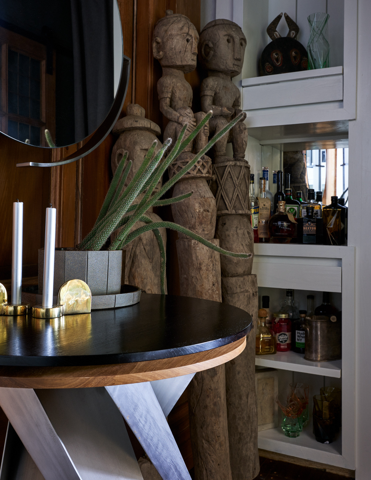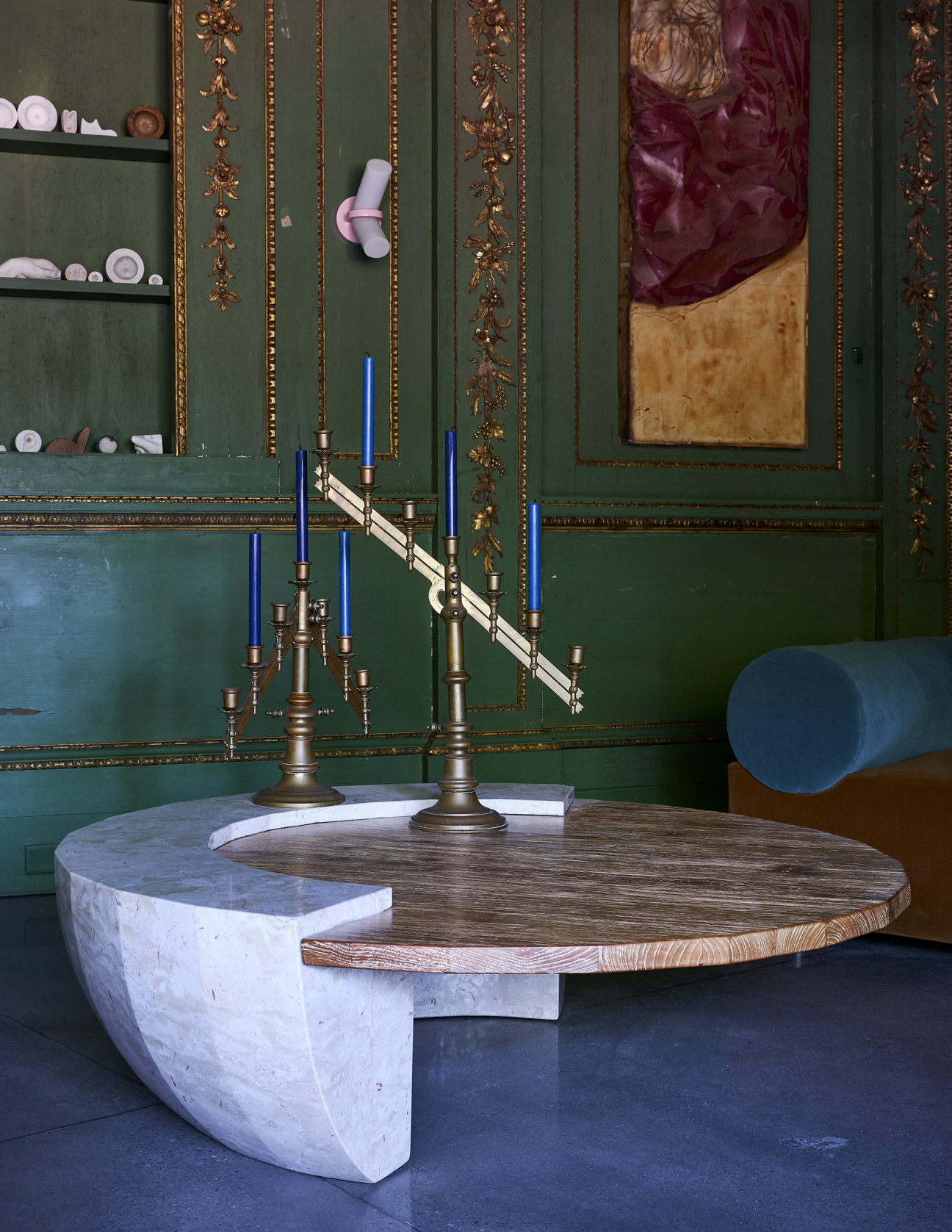 It's how he is envisioning this New York base, as well: an ever-changing display of unique pieces and the headquarters of his firm, Max ID NY. Over coffee in the Bridgehampton, one can sink into a deep, velvet-covered sofa whose back and armrests are composed of a continuous cylinder stacked on a parallelogram base with short piloti or perch atop a teak stool—wheeled for ease of movement—in the open plan boardroom, whose bi-part table contrasts a reclaimed wood top and waterfall side with a marble hoop with artful cutouts as its second leg. Here, one wall is mirrored while two others are a dynamic display of teak and Suar tree trunk tables from Indonesia, hung by their tops so their branched bases create a forest-like surround, his own version of the decorative paneling at the entry.