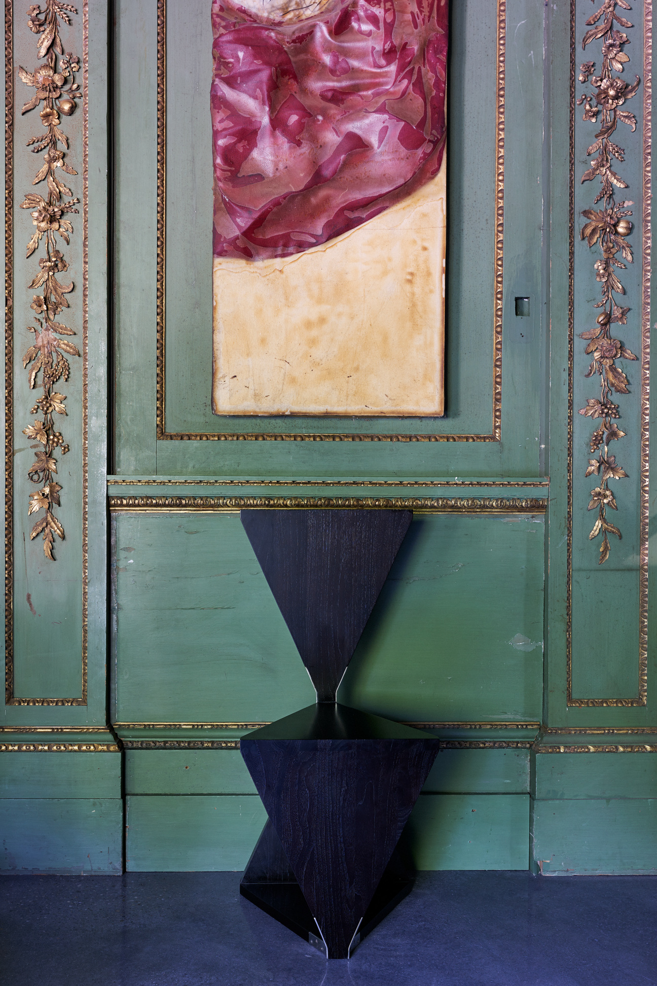 With an oeuvre spanning geometric tables, luxuriously upholstered seating, unique lighting, and glacier-influenced glassware, Eicke approaches his work architecturally, designing furniture he can physically make with industrial materials or using three-dimensional modeling to create angular geometries. He grew up mostly in Sag Harbor, New York, where his parents ran the beloved Christy’s Art Center antiques gallery. After studying interior design at Griffith College in Dublin, he moved to Bali, met his Russian-born creative and life partner Irina Eicke neé Kro, and built a home. The designer cites the Bauhaus and De Stijl movements as long sources of inspiration. But it was there in Indoensia that he learned to appreciate the organic forms he saw around him and now, with Irina’s encouraging eye incorporates a new softness into his work with an emphasis on natural materials. The Balinese home he designed is a sort of living showroom, where prototyping and research and development occur (but one where his parents also now live).