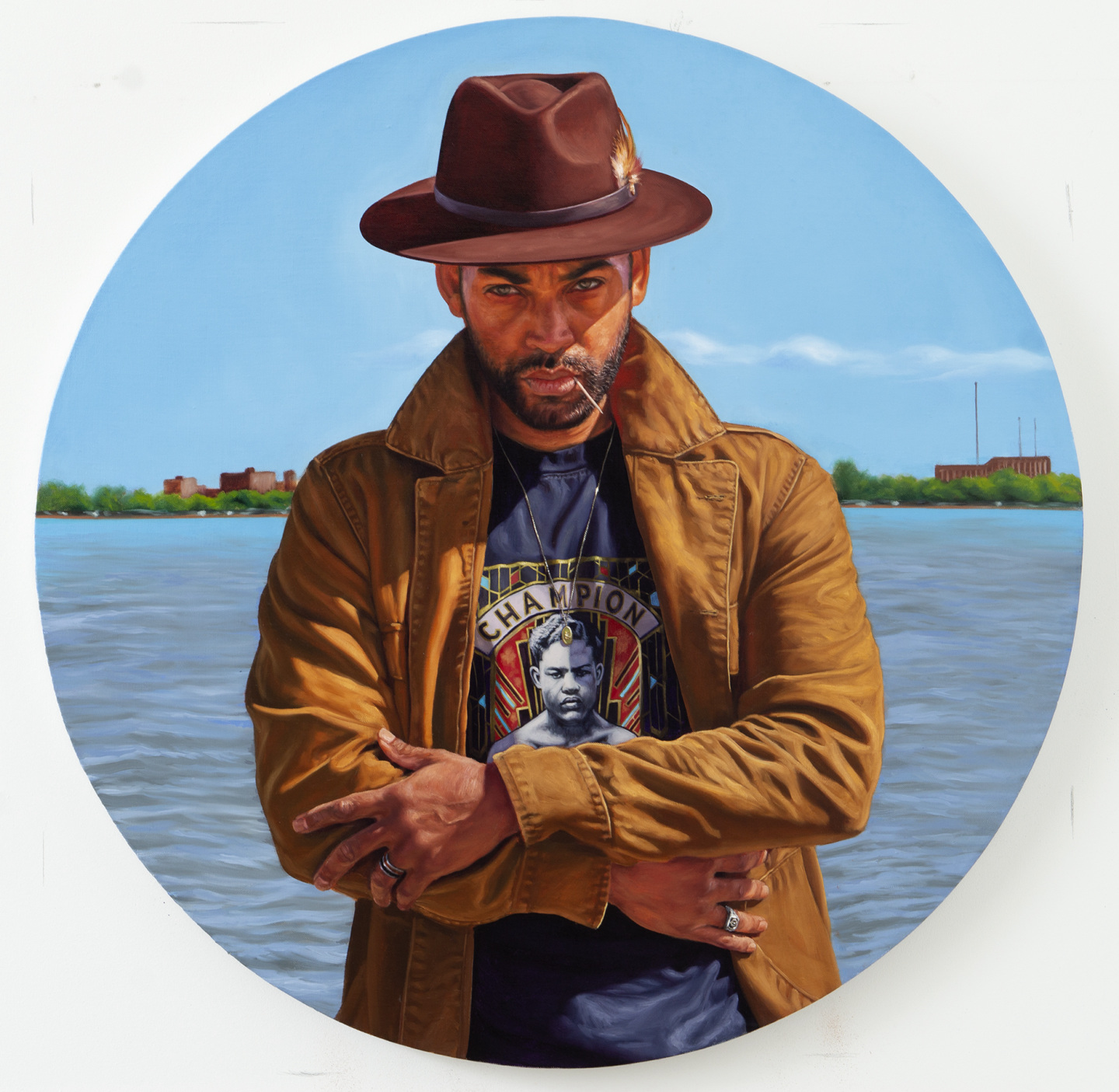 MM: It's funny, you can go anywhere in America, and if you say “What up doe?” They say, “Oh, you must be from Detroit.” That’s the way that we control language or contribute to language. I’m not just talking about Detroit, but Black people in general. My friend, the incredible sculptor and jeweler, Tiff Massey really epitomizes that Detroit sensibility. I wanted to portray contemporary figures like her with that kindred spirit and soul of Detroit. Notice how she's standing in the painting: it's almost like she's unmovable. I want you to feel that kind of presence in her stance, in the figure. And again, she's surrounded by water, but just on a technical or aesthetic plane, she's almost silhouetted by the light that's behind her. As you mentioned, I like to approach a painting with a challenge, meaning I like to keep things intriguing. I asked myself whether I could paint a figure in a way that you see them back lit, but still see their features. That became like the language of the painting. And really that was Tiff.