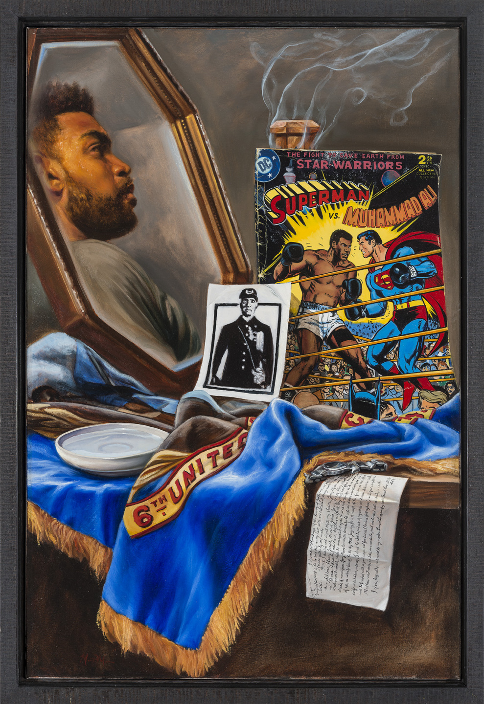 Rooted in historical elements, Moore’s paintings introduce multidimensional subjects, creating scenes that capture the verve of Detroit in a powerful blend of the soulful and the commonplace. Of note in Moore’s work is the notion of overcoming limitations. When the artist learned that one of his ancestors—a great-uncle going back several generations—was enslaved as a child and later fought in the Civil War, he sought to explore the meaning of being a Black man fighting for a country that didn’t want him in uniform. Comparing this to contemporary associations between Black men and weapons—and to January 6, an event in which mostly white men fought exclusively for their own rights, in large part at the expense of the rights of others—Moore leverages his voice to create meaningful conversations.