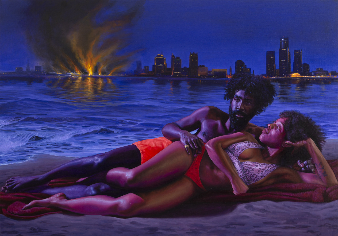 The artist received his BFA in Illustration from Detroit’s College for Creative Studies and an MFA in Painting from the Yale School of Art, and he continues to gather information autodidactically. He spends a great deal of time in bookstores, having recently read A Fluid Frontier, a work detailing the founding of African-Canadian settlements in the Detroit River region in the early 19th century. The book had a deep influence on Moore’s current exhibition “Midnight and Canaan: Detroit” at David Klein Gallery, which explores the history of Black people in Detroit: their contribution to the city, their agency, and their efforts in helping their peers move from the South into Michigan and then on to Canada.