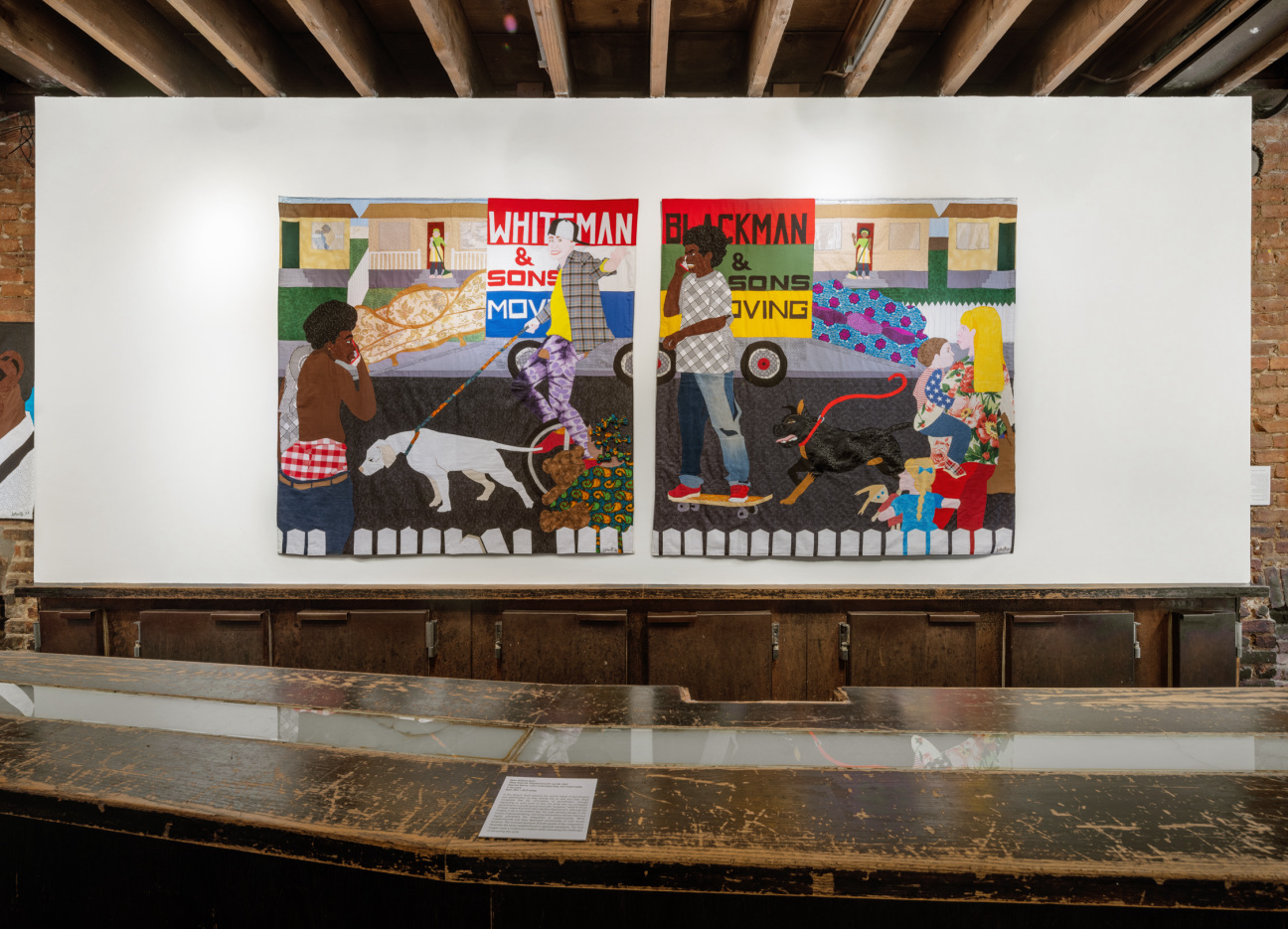 For this reason, the artist Dawn Williams Boyd chose to make Massacre on Black Wall Street, one of a dozen paintings included in the “The Tip of the Iceberg,” which is on display until December 17 at Fort Gansevoort in New York. Measuring nearly five-by-ten feet, the work presents the event as a narrative panorama: a group of white men cock and aim their guns as townspeople hide, surrender, or lie dead on the ground above a cache of human skeletons buried beneath them, while a plane decorated with American flag and Ku Klux Klan insignia flies overhead, dropping Molotov cocktails on the city’s buildings. Unlike most paintings, however, Boyd’s are made with a collage of fabrics, cut and stitched together with intricate detail. Looking closely at Massacre on Black Wall Street, you might fall down a rabbit hole, noticing its ingenious deployment of each fabric, like the delicate lace panels used for a storefront’s windows or the black and brown batik bearing Ghanaian Adinkra symbols that serves as a tree’s bark—and a subtle reference to Greenwood District’s African roots.