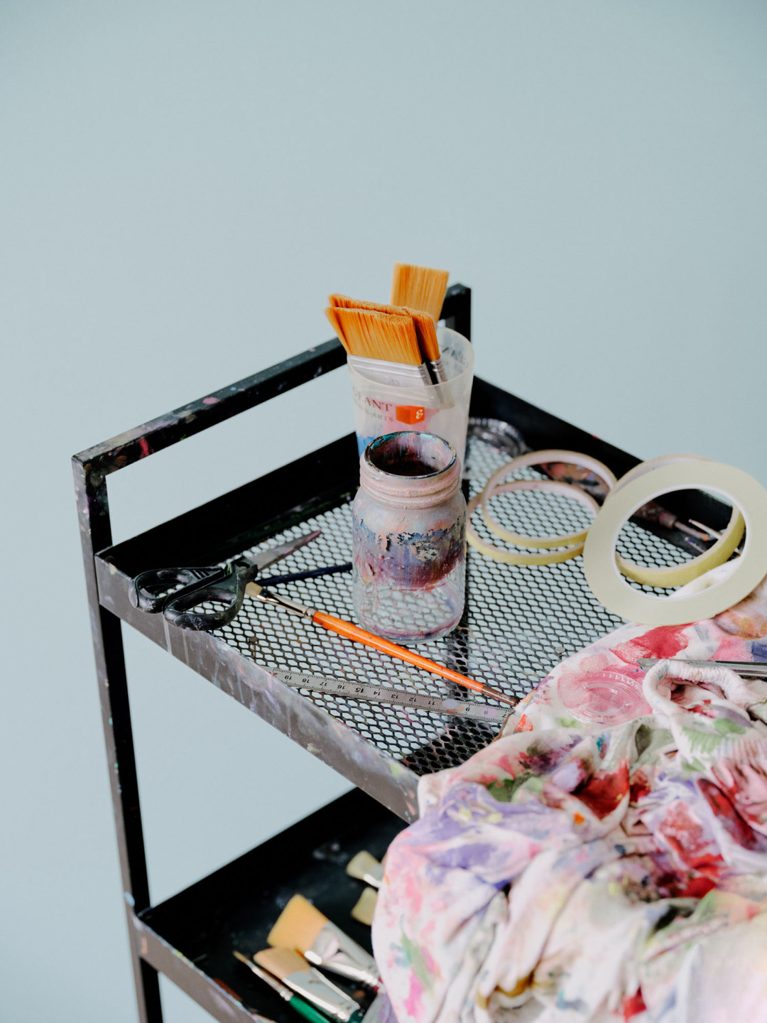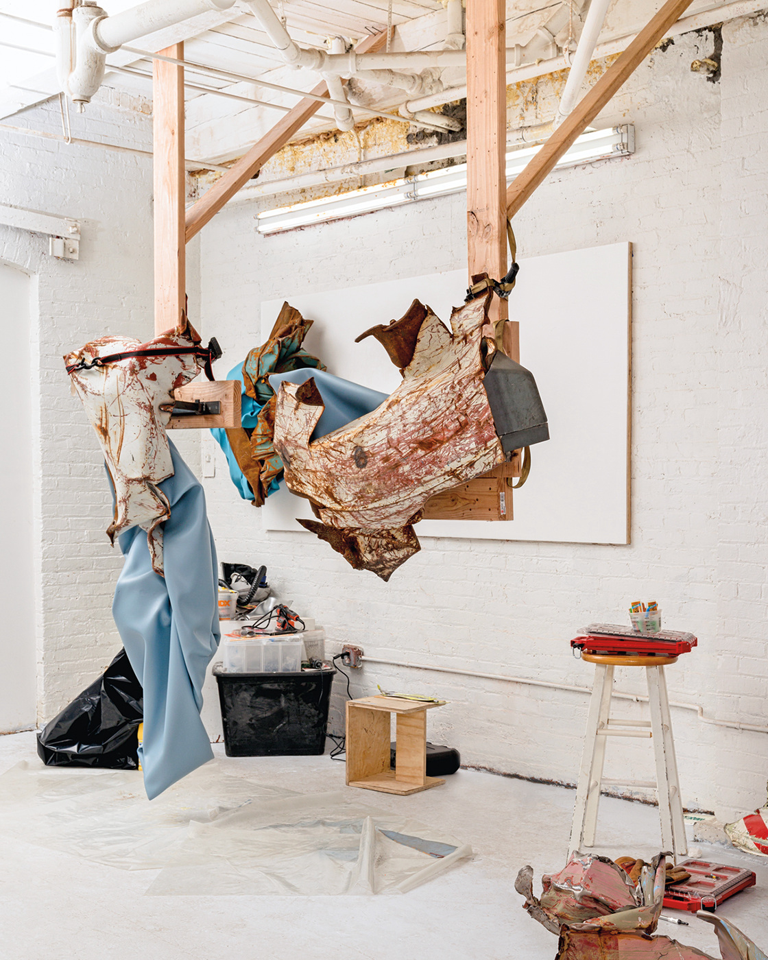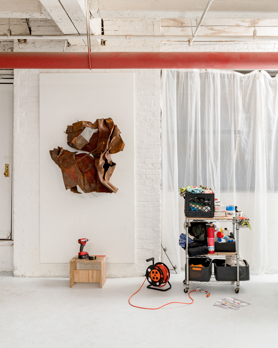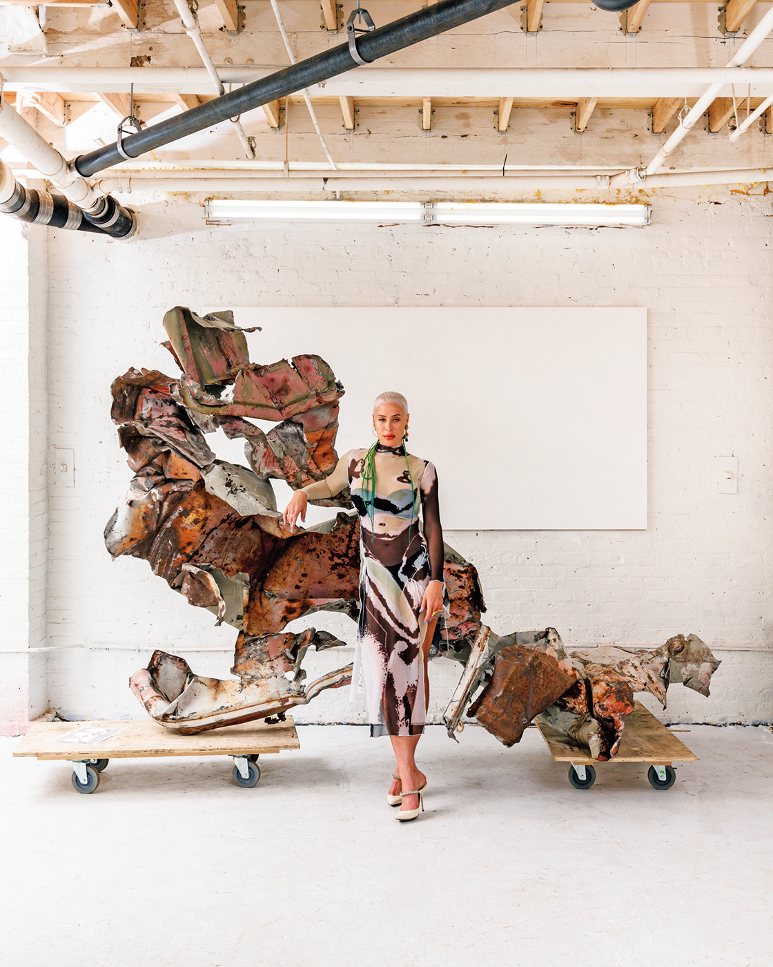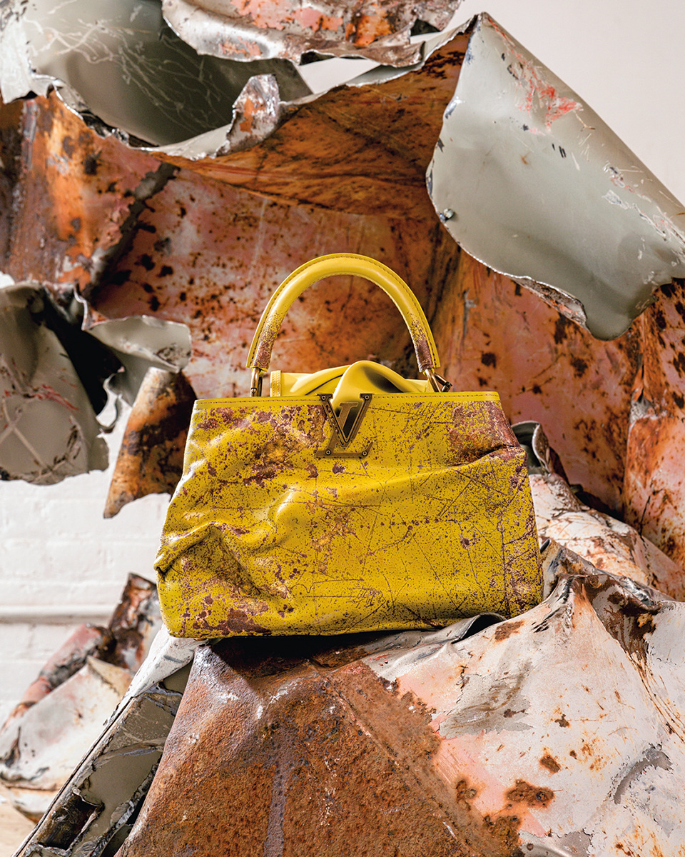 One of today’s most exciting and sought-after young artists, Brooklyn-based Kennedy Yanko uses found metal and dry sheets of paint to sculpt abstract large-scale works that, often, seem to defy gravity. For her Artycapucines design, however, she thought about the utility of the bag, and the person who wears it. “I was particularly interested in making something that was functional,” explains the artist, whose fashion-forward sensibility makes her a fixture at shows, both on the runway and off. “I wanted a bag that you could use at any event and with any outfit; for example, the handle comes off, and there’s a pouch underneath it, so you can slide your hand and then carry the bag as a clutch.” Referencing her own work, the bag’s body was patinated via 3-D printed rust.