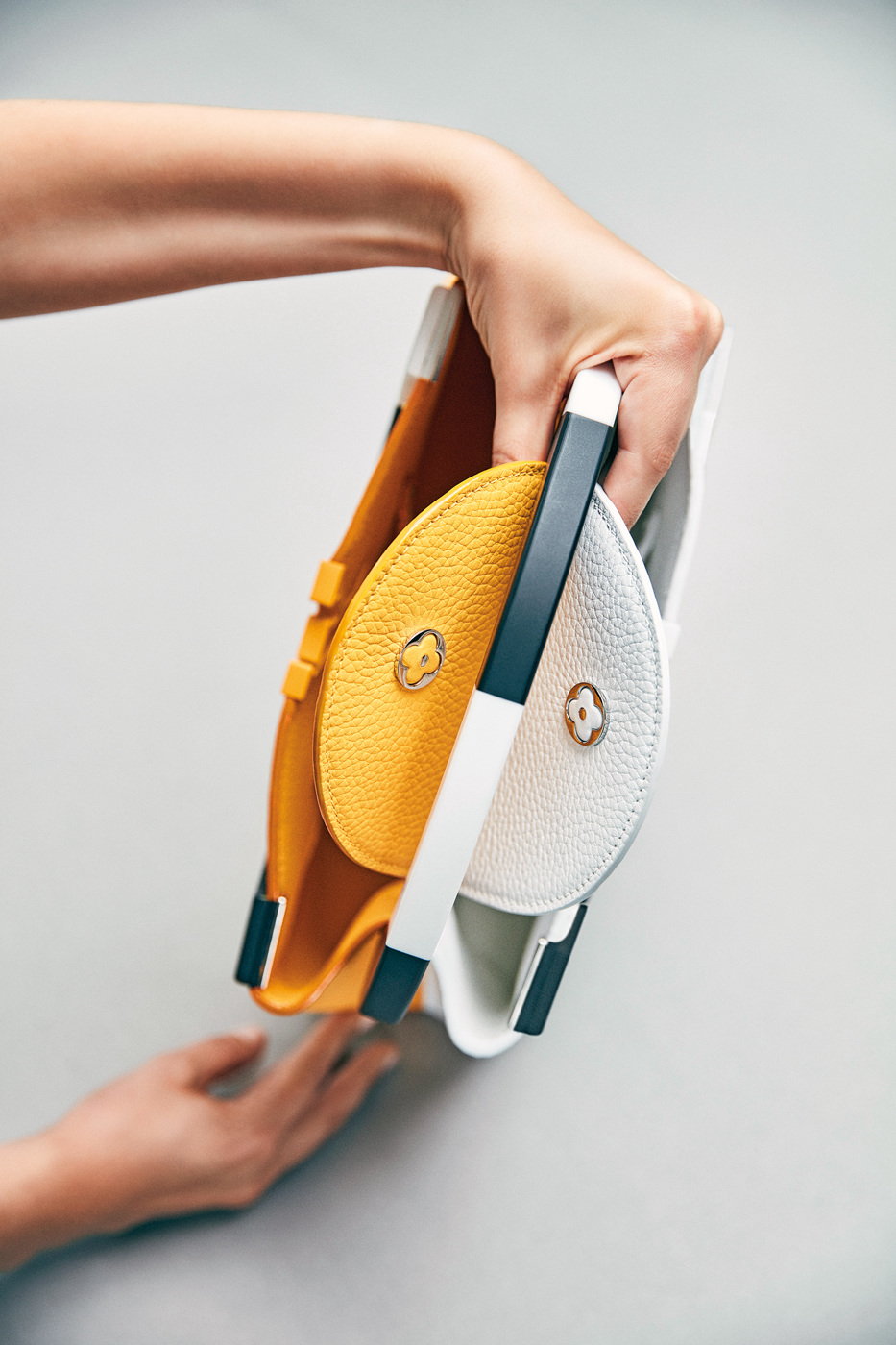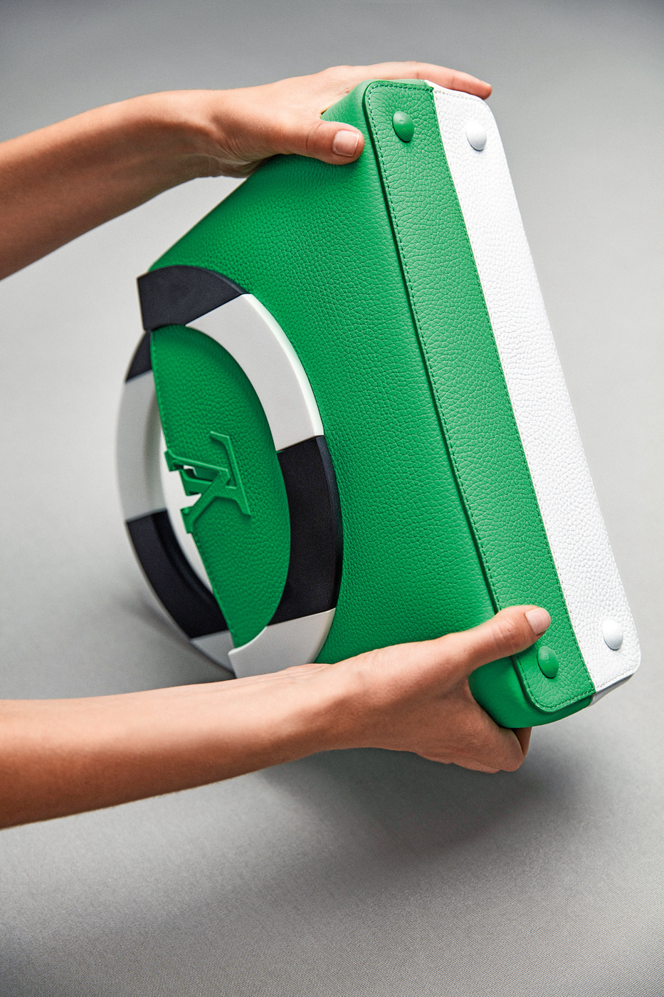 French conceptual artist Daniel Buren has long played with shapes in his practice. His 2022 Artycapucines design is no exception. This special piece—available in four colorways, each a limited-edition of 50—is a geometrical composition that engages the artist’s signature vertical stripes. “My initial sketch was rather abstract, but the object’s function was still clear,” says Buren. “By making the handle an exact semicircle and transferring it to the body of the bag itself, two shapes emerged: a trapezoid and a circle.” In its coloring, art aficionados will recognize an allusion to one of the artist’s most spectacular recent works: Observatory of Light, which wrapped the exterior of the Louis Vuitton Fondation in Paris in 2016.