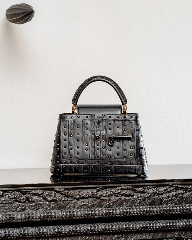 Celebrated architect Peter Marino has a longstanding relationship with art and fashion, as a seasoned art collector and the designer of many boutiques across the world, including Louis Vuitton flagships in London, Los Angeles, Seoul, and Paris. His architectural practice often revolves around designing for artworks, while his 2022 Artycapucines edition was inspired by a singular piece: the all-black locked and studded design found its inspiration in a medieval box Marino saw in Venice while fundraising for Venetian Heritage, the preservation organization he heads. “We were raising funds to restore a 14th-century building in Venice called Scuola Grande San Giovanni Evangelista,” Marino recalls, “and I noticed a medieval box near the monumental staircase designed by Italian architect Mauro Codussi.” Its antique straps and closure motivated the exclusive design of a newslide-bolt closure for the Louis Vuitton bag.