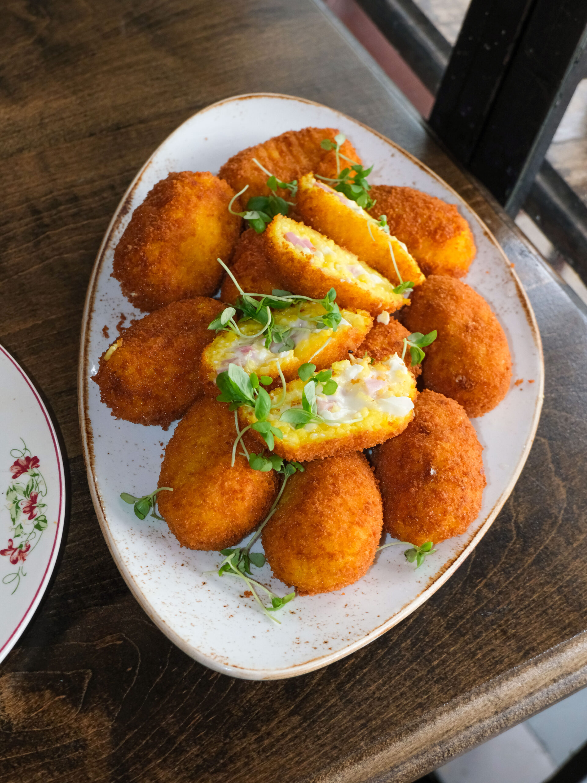 Arancini are also very popular today, but the dish actually dates back to the 9th century. Arab sailors brought it over because these pockets of rice and filling were an easy way to get protein without having to cook. When they arrived in Sicily, arancini caught on, and the Sicilians transformed it into a daily staple. My favorite is a saffron arancini filled with bechamel and prosciutto cotto—that brings me back to my childhood.