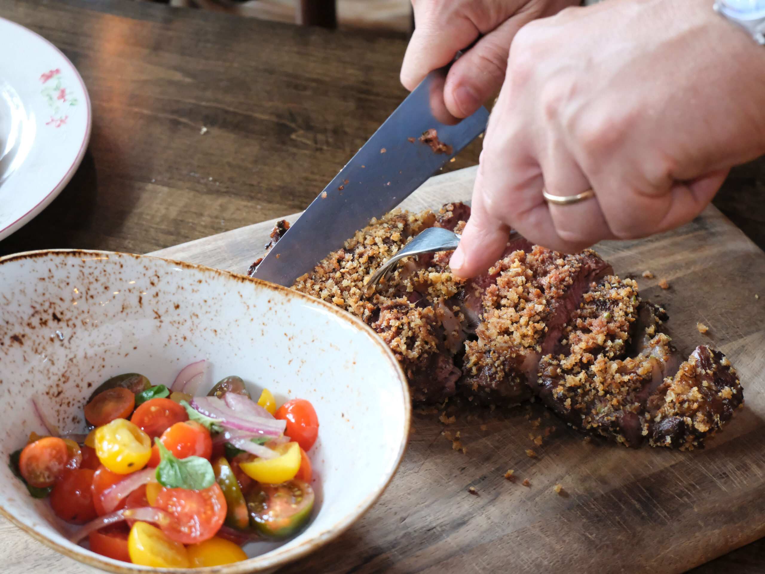 “The main course, of course, is Palermo-style steak. It’s a traditional ribeye, which is sliced and smothered with bread crumbs. Sicilians love bread, by the way. There’s a story that, back when the Spanish were ruling Palermo, they decided to reduce the standard size of a bread loaf but still charge the same price. Of course, the Sicilians revolted. The dish is served with a light tomato salad with red onions and oregano, which is a perfect combination. I would serve that prepared over an open barbecue for a last hint of that summer taste.
