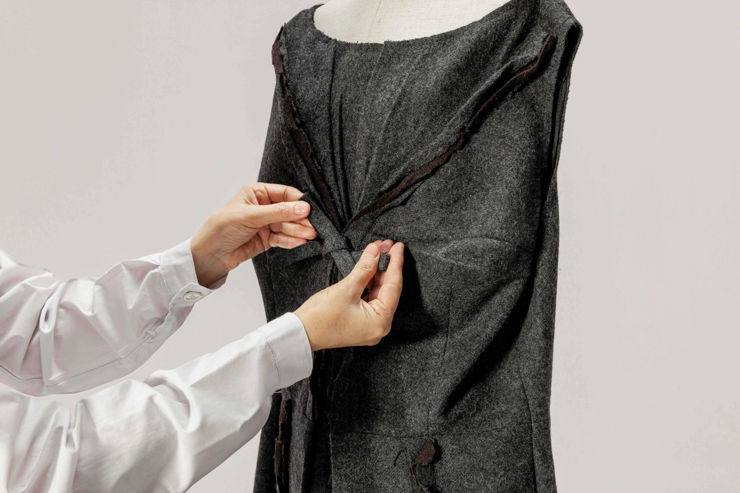 A slate gray, Shetland wool dress was lifted from its native corporate-conservative habitat and cinched, pulled, and rethreaded into a bloom of contours. A nipped waist gives way to a softly construct-ed knot at the bust, both anatomically observant and abstract. In Milan this past February, the dress traipsed down the runway, styled with stomp-worthy boots and a plum-red leather handbag as the collection’s stylist, Olivier Rizzo, juxtaposed office finery with the unkempt edge best associated with after-hours diversions.