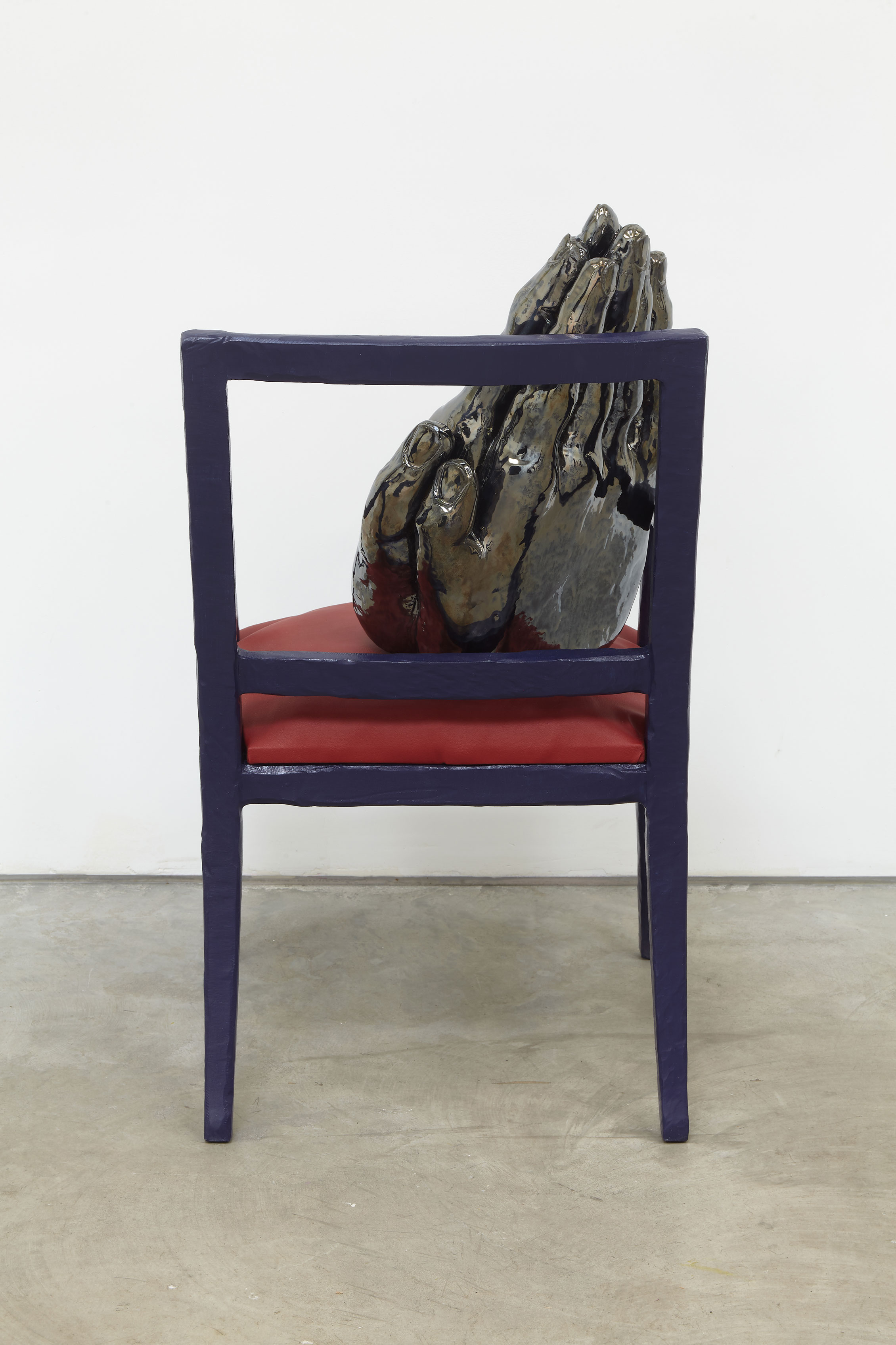I can’t help but think of Louise Bourgeois and her Cells as I peer into one of Woody De Othello’s sculptures where a desktop mirror stands inside a set of closed doors only viewable through the hinged slats. In Bourgeois’ Cell series, her impenetrable rooms play with bodily association of chambers within chambers and the way these structures both house and cage us. It is a kind of visual pun and De Othello’s seems to be too. His show title “To live in hope” certainly bites and encourages us not to take his ceramic praying hands at face value. But who could? They are paired with the imagery of sorrow: broken clocks, barred windows, chains and a sawed off ladder that calls to mind Bunny Roger’s milky-pen colored Columbine props at the Whitney. The effect is like a graveyard or memorial where objects stand in for the ones who couldn’t anymore.