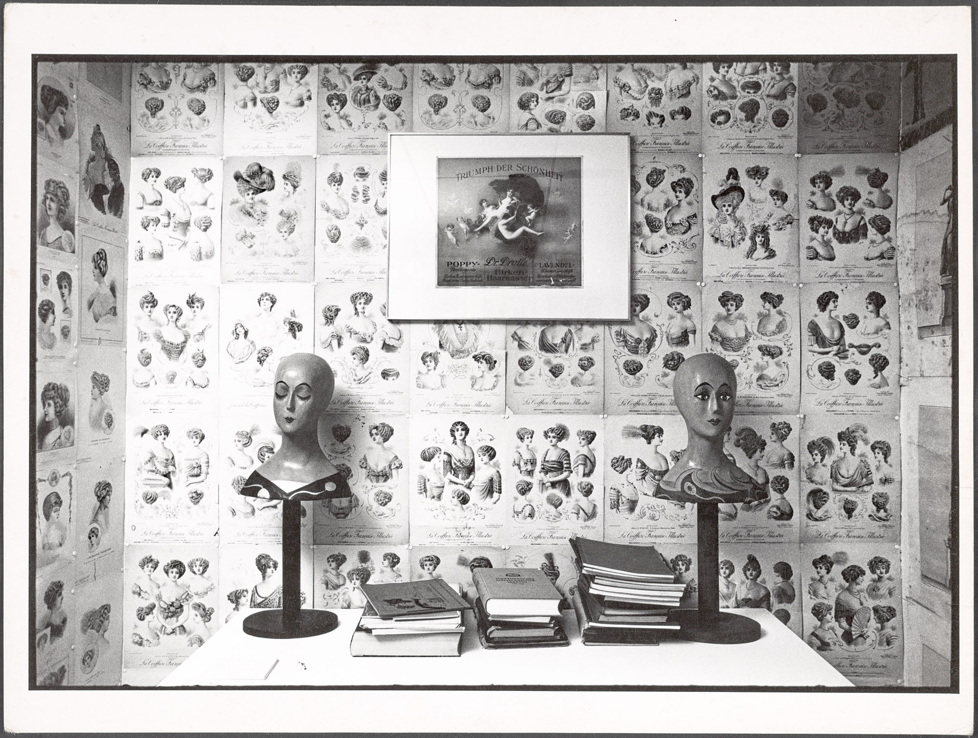 Installation view of wig stands and books, as installed in Grossvater: Ein Pionier wie wir (Grandfather: A pioneer like us), Galerie Toni Gerbe. Photographer: Balthasar Burkhard. Courtesy of Getty Research Institute, Los Angeles.