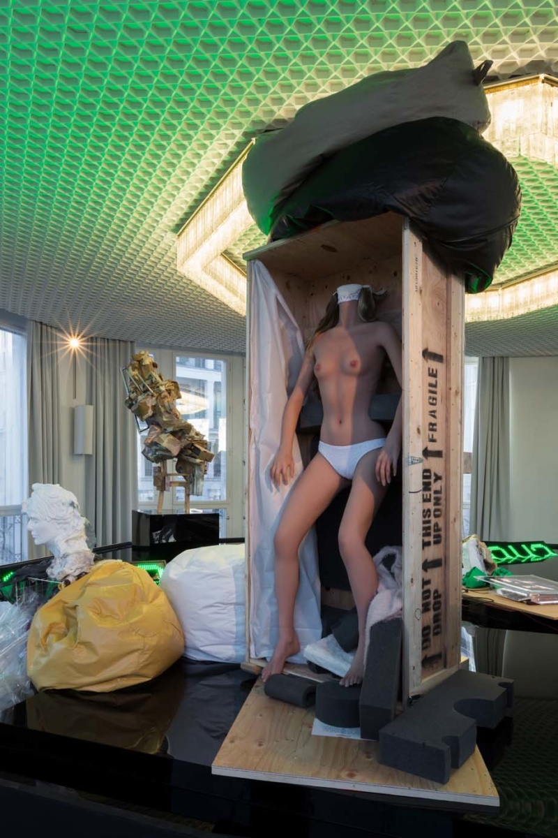 Anima of a Relationship (2020) revealed itself to me first materially, and then substantively after speaking to you. The materials: silicone sex doll, wooden shipping crate, beanbag chair, packing foam, plastic foil, synthetic sweater, cotton batting cushion, deconstructed slipper, synthetic wig, upholstery needles, white panties, paper, cushions, metal rod, rope, leather belt, plastic shipping crate, clay, acrylic paint, shower curtain. Black thick foam that appears to have held the doll in place still keeps part of the body inside the shipping crate while other foam, pulled off the doll’s body to open the crate, is meticulously placed next to the doll’s left foot. The doll’s right foot, meanwhile, has slid outside of the crate, French tips slightly chipped. Instead of a head, what appears to be shearling covers the doll’s neck hole. Beanbags, plastic foil and other materials rest between the doll and a bust that looks almost as though it has just been unwrapped from the black plastic on which it sits. Looking at these two figures, I cannot help but consider how I’ve always found intimacy as a form of projection and a form of leaping, and how in the act of intimacy we assume a great deal about who we are intimate with, and often that assumption is merely a reflection of ourselves. Later you explain Anima’s particular relationship to projection: how projection, specifically feminized projection (projecting onto women), creates a trap that is replicated and perpetuated, and that you are not a stranger to such projection.