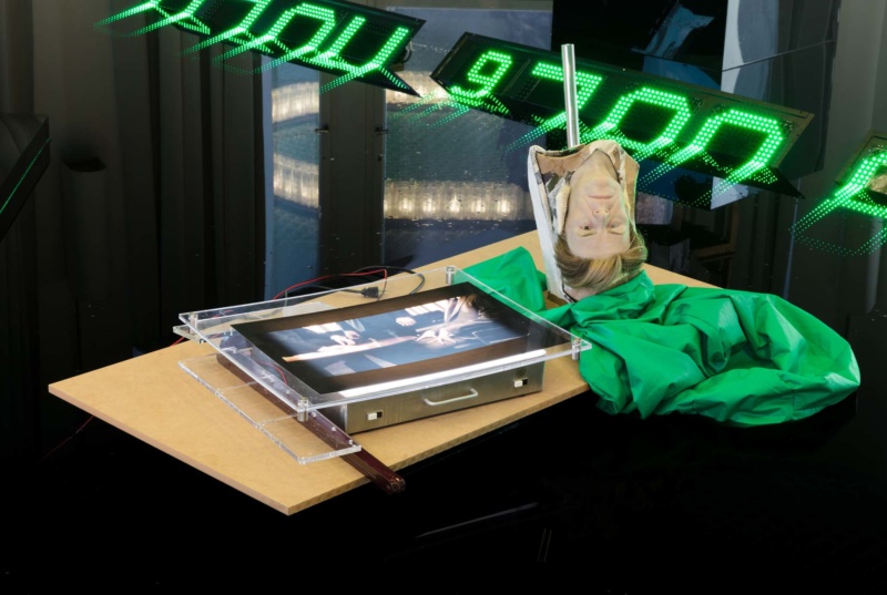 In an eight-sided plywood basin filled with what appears to be inky black water, your sculptures rest on black plexiglass pedestals. Sunken within the basin, a large green, almost stadium-ready digital clock, nearly halfway submerged at an angle, reflecting and distorting itself. The basin pushes inward the iconic architecture of the Schinkel Pavillon, occupying the floor as a reflexive, barely moving body.