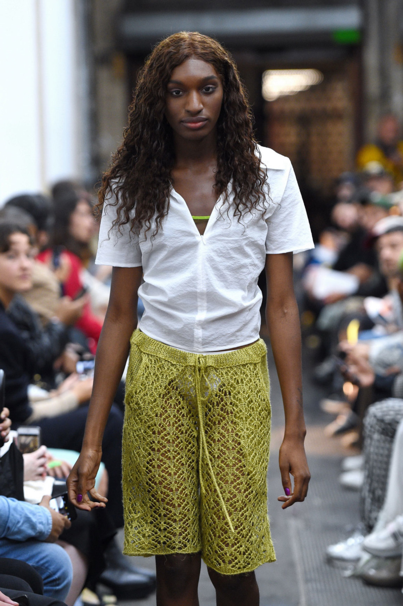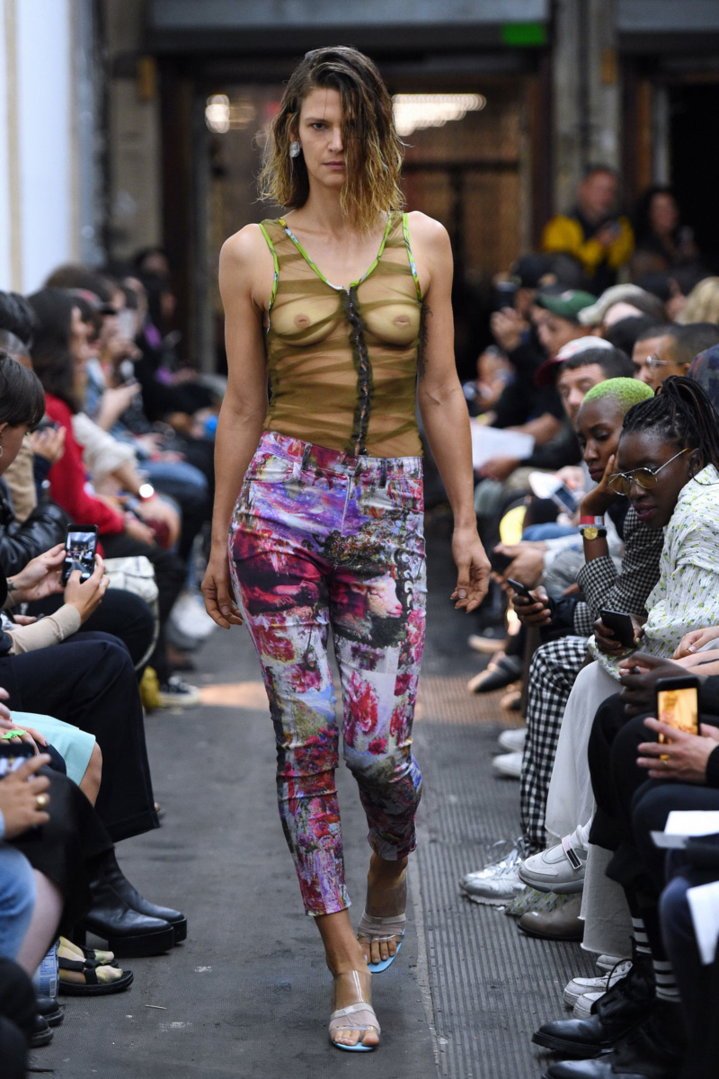 Gauntlett Cheng’s whole vision for SS19 courts some form of desire or another. Their almost wet-looking fabrics, bright tropical patterns by artist Jared Madere and beachy silhouettes respond to what was racing through the designers’ minds this summer: an endless diet of Instagram vacation envy—al fresco lunches in seaside towns and bikini-dotted yacht decks. “We’re watching everyone having these beautiful Italian summers that are not available to us because we’re toiling away in our hot studio making clothes,” Gauntlett continues, “so the summer house fantasy elements are definitely in there, and then there is also this element of nostalgia for the summers we had growing up: the board shorts, the polos. We found ourselves attracted to materials that seemed almost wet. You know that moment when you pull your shirt over your wet bikini and suddenly your see-through in a way that feels sexy and improper.” This cheeky humor was echoed by the models’ laughter as they strutted down the boot-wetted runway that night. Of course, who wouldn’t crack a smile with their ass hanging out of a pair of sheer trousers or the gaping window of a skin-tight dress?