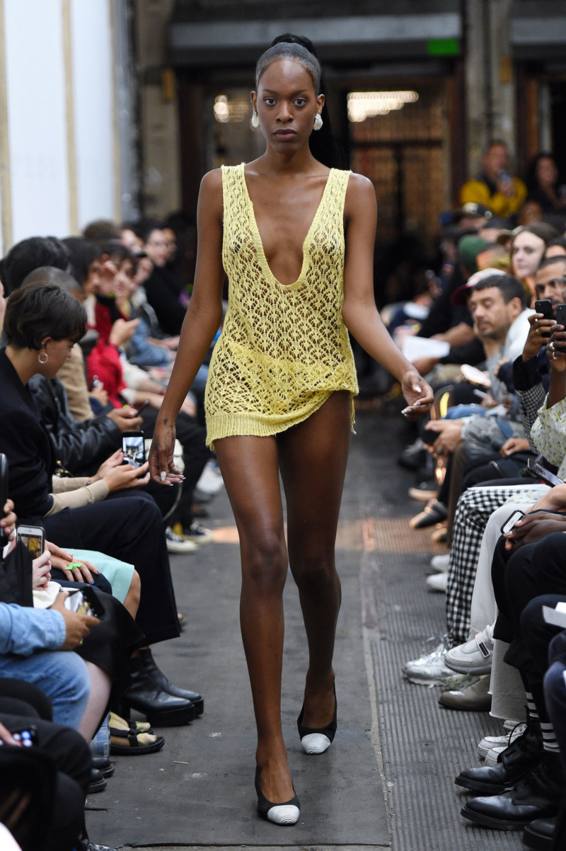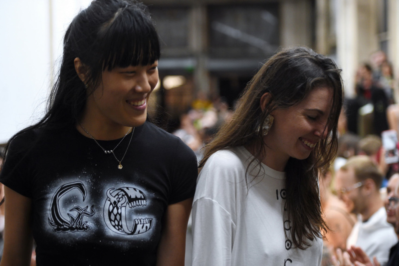 The looks that walk–slashed sundresses, transparent pants, see-through cable knits–are what everyone is here for–if not to cheer on their friends, the brand’s founders Jenny Cheng and Esther Gauntlett. The duo’s theatrical erotics and off-kilter collaborations have earned them a prurient reputation that now stretches beyond the art world bubble–dipping its toes into the mainstream–a fact that is evident from the stack of fashion magazines also in attendance.