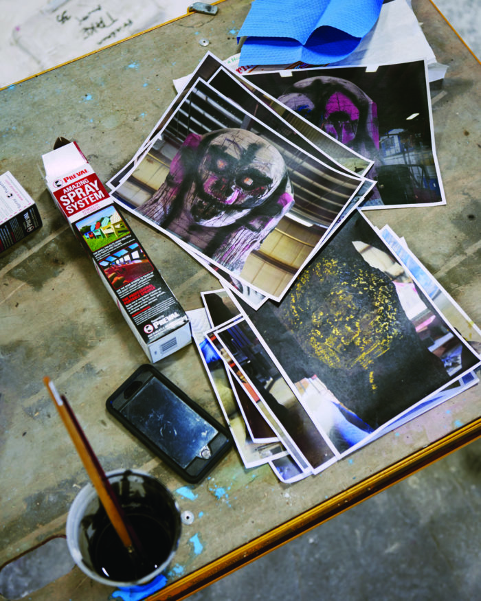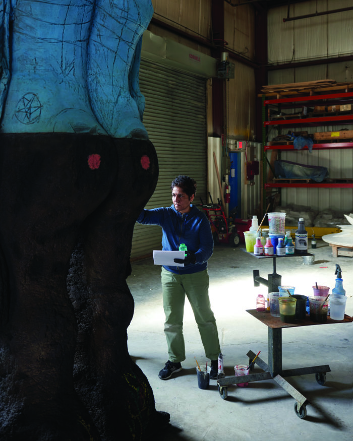 On the day I visit, several cork pieces stand in groups in the Poughkeepsie, New York studio that takes up the ground floor of an old firehouse, where she lives with her husband, Jason Fox, and two large, frisky dogs. There are hatchets for hacking at cork, chisels and other tools, a pile of blue Styrofoam, blocks of wood, stacks of works on paper. Unlike many of her colleagues, Bhabha prefers to commune with her subjects alone, without the aid of assistants.