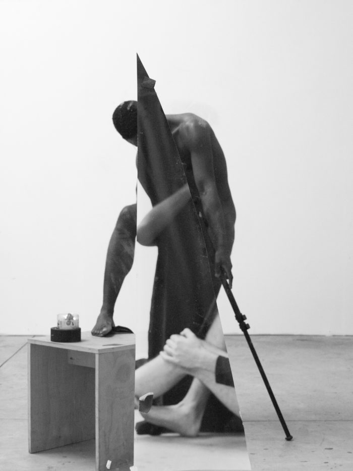 The picture is titled Mirror Study for Vince (0X5A0172) because it was made as a gift to the photography critic and historian Vince Aletti. The 1950s beefcake picture held by the outstretched hand (likely Sepuya’s) in the photograph was, in turn, a gift from Aletti. In addition to the physique photograph, several female nudes appear on the curtain-like studio notes as do fragments of Sepuya’s own work. Mirror Study for Vince (0X5A0172) conjures a short history of queer cultural production within the space of a contemporary photo-studio. It demonstrates how Sepuya’s working method becomes his creative product. Historical research charges and changes current realities.
