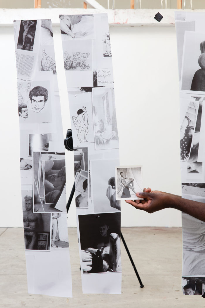 One of Sepuya’s pictures layers the history of studio art and photography in a particularly haunting and effective way. It features three long, curtain-like expanses of paper, horizontal segments of another photograph of a wall in the artist’s studio, to which a number of drawings, clippings, and photographs have been affixed. These annotations include several drawings by Richard Bruce Nugent, a leading Black gay poet and visual artist in the Harlem Renaissance, Larry Rivers’ startling 1954 portrait of Frank O’Hara naked save for his leather boots, and a 1934 Cecil Beaton photograph of the homosexual painter, Pavel Tchelitchew, in the midst of portraying Peter Watson, an English collector and “benefactor” (shall we say) of other men. A partial view of a camera on a tripod peeks out from behind two of the paper curtains.